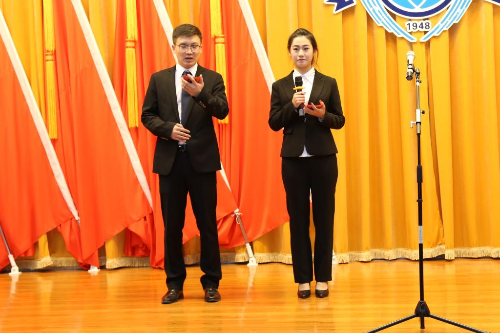 | 铁道运输学院辅导员周兴、城市轨道交通学院学生荀浩主持比赛 |