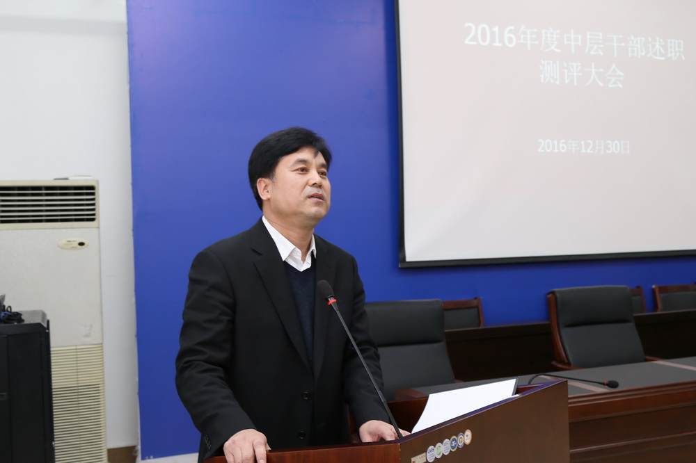 ,学院召开2016年度中层干部述职测评大会,学院党委领导班子成员、中层及以上干部和部分教职工代表参加会议。会议由田雷副院长主持。