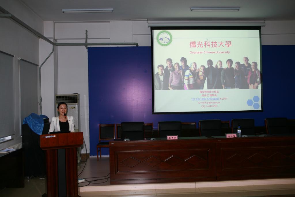 会后,傅秀仁国际长以及汤恬恬副国际长在行政办公楼五楼会议室为我校学生进行留学宣讲。在宣讲会上,汤恬恬副国际长生动地为同学们介绍了台湾的风土人情以及侨光科技大学的办学条件和办学特色,并与我校学生进行了积极地互动。