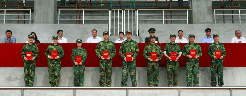 闭营仪式上,院长周云龙检阅了2015级全体参训同学,学院全体军训学员分9个营32个连队进行了军训成果汇报分列式表演。纪委书记徐彤宝代表学院向65307部队赠送“舟桥劲旅誉满江城 铁院军训尽显神威”锦旗。副院长田雷宣布军训表彰决定,对10个先进集体、220名优秀个人进行了表彰,学院领导及部队领导为获奖的先进单位和优秀个人代表进行了颁奖。
