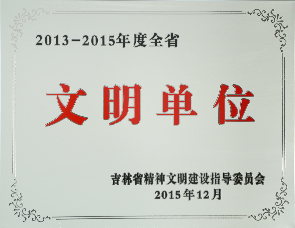 2015 年12月15日 ,吉林省精神文明建设指导委员会下发《关于表彰2013—2015年度全省精神文明建设先进集体和先进工作者的决定》(吉文明委〔2015〕6号),授予我院2013—2015年度全省文明单位称号,这是我院继2004—2006年度、2007—2009年度、2010—2012年度第四次荣膺此项殊荣。