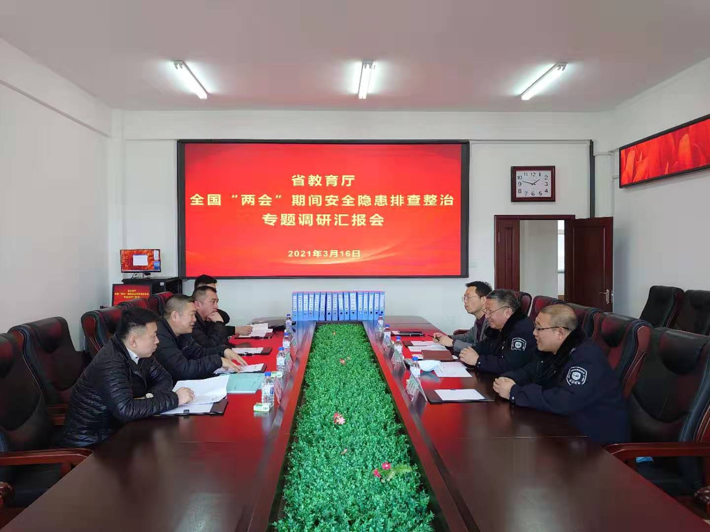16日下午,学校在办公楼三楼第一会议室召开汇报会,省教育厅调研组全体成员、我校安全保卫处处长张兴志,安全保卫处吴穹、吴宇飞、王弘屿参加会议。会上,鞠海石介绍了此次教育厅调研的目的、要求和工作任务,明确了调研检查程序。张兴志简要介绍了我校的发展建设情况,汇报了我校全国“两会”期间安全隐患排查整治工作落实情况。会后调研组深入我校教育教学融合指挥中心、消防监控室、学生公寓、学生食堂等实地检查安全隐患。
