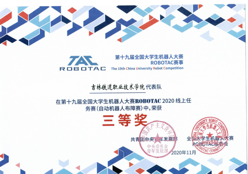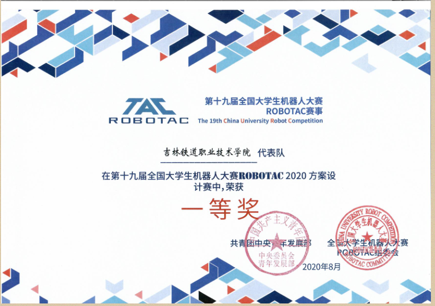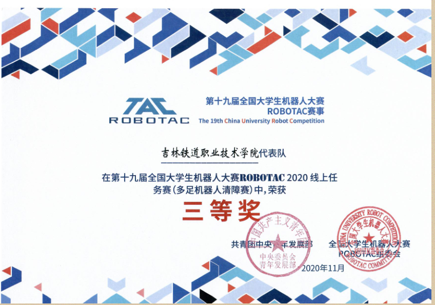 第十九届全国大学生机器人大赛下设4项赛事,其中ROBOTAC(Robot +Tactic)是中国原创的国家级机器人竞技赛事,被纳入全国普通高校学科竞赛评估体系。ROBOTAC赛事下设4个分赛项,分别是“ROBOTAC方案设计赛”、“自动机器人布障赛”、“多足机器人清障赛”和“手动机器人速胜赛”,我校代表队在“ROBOTAC方案设计赛”中斩获一等奖,在“自动机器人布障赛”和“多足机器人清障赛”中都分别获得了三等奖。