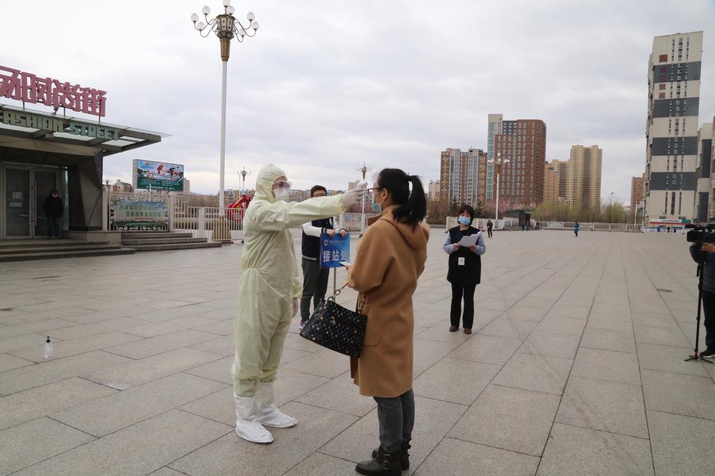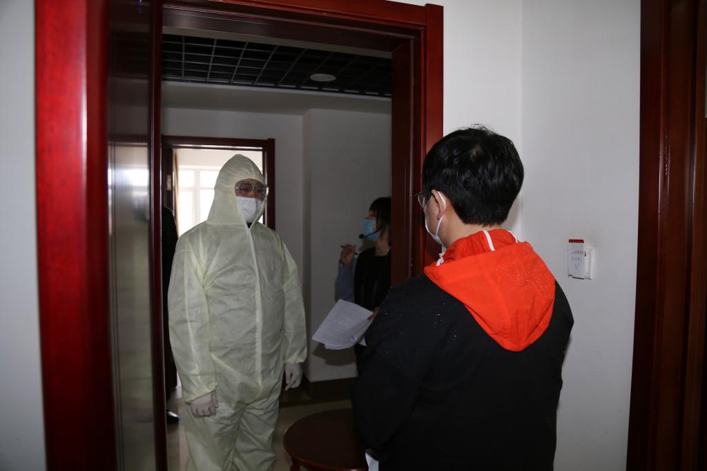 在吉林站东出口,校团委组织统一接站,在工作人员的带领下,返校“学生”间隔一米距离站队到达停车点,拿出手机APP展示前期返校审批结果和相关证件进行身份核验后,进行体温检测、手部消毒和口罩更换,随后有序登车,并在工作人员组织下进行乘车登记。在校门口处,返校“学生”依次经过测温区、消毒区、身份核验区。在公寓,“学生”对《健康登记表》进行签字确认,拿出手机扫码确认身份匹配,在经过测温门提示体温正常后进入。在食堂,“学生”经过测温门提示体温正常后进入,进行手部消毒,并保持一人一桌、同向就坐有序就餐。在教学楼,各教室桌椅摆放数量减半、拉开距离,并在每一个教室里都配备了体温计、消毒和通风记录本。在集中医学隔离观察区,“留观人员”、体温检测、送餐、保洁、消毒工作人员都需经过指定路线进入、离开。并按照规范进行个人防护,处理防护装备。