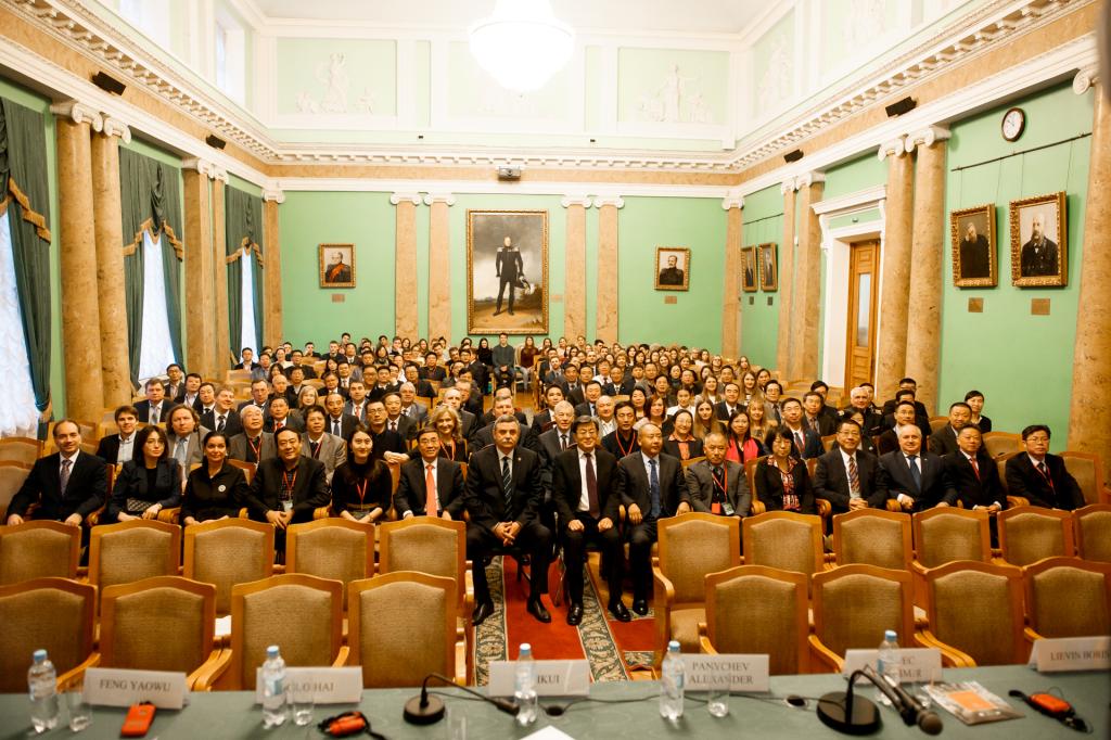与会期间,曹炳志院长同圣彼得堡国立交通大学校长亚•尤•帕尼切夫(左一)、欧亚国际协会会长冯耀武(左二)、俄罗斯交通大学校长鲍•阿•廖文(左四)、圣彼得堡国立交通大学中俄交通学院院长叶•亚•阿法娜斯耶娃(右四)、俄罗斯联邦铁路局局长弗•尤•切别茨(右三)、中国人民对外友好协会秘书长李希奎(右二)、北京联合大学校长李学伟(右一)等进行了深入交流,为学院在俄罗斯、金砖国家及欧亚交通走廊国家开展国际合作交流奠定了良好的基础。