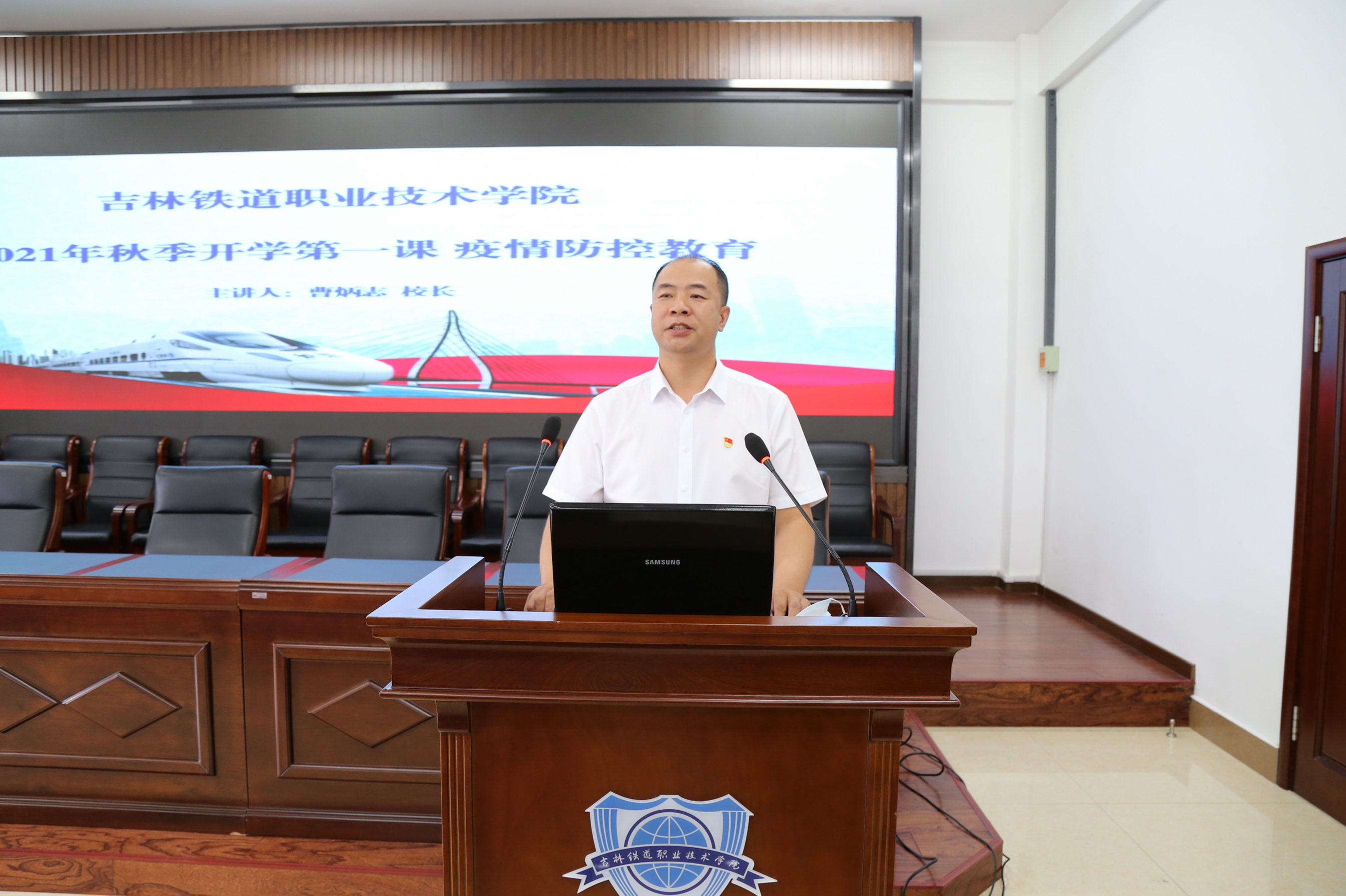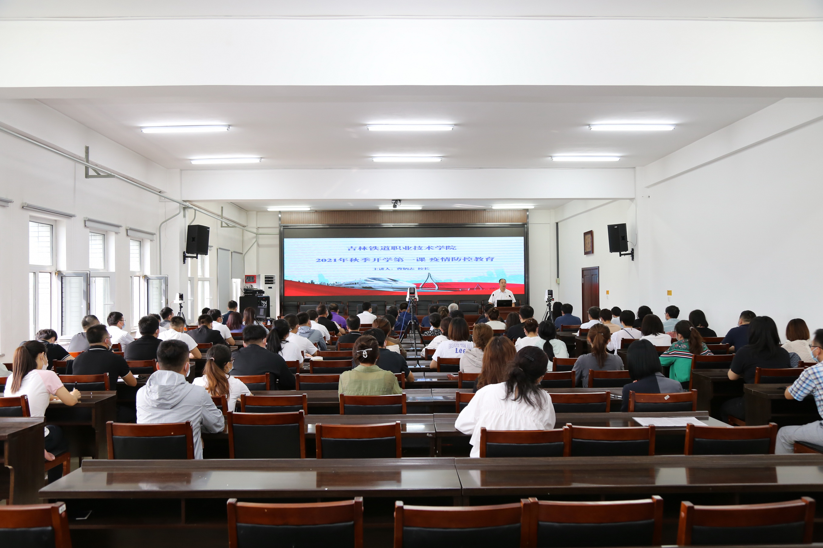 为贯彻落实国家卫生健康委员会、教育部《高等学校、中小学校和托幼机构新冠肺炎疫情防控技术方案(第四版)》,教育部《关于统筹做好2021年秋季学期开学和疫情防控工作的通知》,吉林省教育厅、吉林省卫生健康委员会《关于统筹做好全省各级各类学校秋季学期开学返校和校园疫情防控工作的通知》等文件要求,帮助师生更好的掌握疫情防控知识,进一步提高疫情防控意识和自我防护能力,确保学生安全顺利返校。8月29日,在开学第一天,校长曹炳志以“不让疫情进入校园 确保师生生命安全”为题通过线上直播为全校师生讲授2021年秋季开学第一课—疫情防控教育。副校长李欣,教务处、学生工作处、信息化办公室、团委、医疗服务中心等部门负责人,各学院党总支书记、党总支副书记、学办主任、团委书记、辅导员以及教师代表在办公楼第三会议室参加会议,其他师生在线上收看了课程直播。