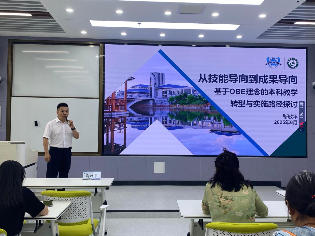 培训聚焦本科教学关键环节,邀请校内外专家作专题分享。拥有数十年教学档案管理经验的张海波副教授,以“建章立制强规范 固本培元促长效”为题作专题报告。他从教学档案的战略价值切入,强调标准化管理是提升教育决策科学性、支撑教育评估与审核的关键基础。其内容详实、指导性强,引发了与会教师的广泛共鸣。靳敏平教授围绕“基于OBE理念的本科教学转型与实施路径”进行深入阐述。他立足当前高等教育改革背景,阐释了OBE(成果导向教育)理念“以学生为中心、以成果为导向、持续改进”的核心内涵及其对本科教学转型的指导意义。通过剖析OBE理念在重构课程体系、革新教学模式、完善评价机制等方面的典型案例,靳教授清晰展示了从培养目标反向设计、课程内容动态调整,到构建多元化考核体系的完整实施路径,为教师教学实践提供了清晰的思路和方法论。